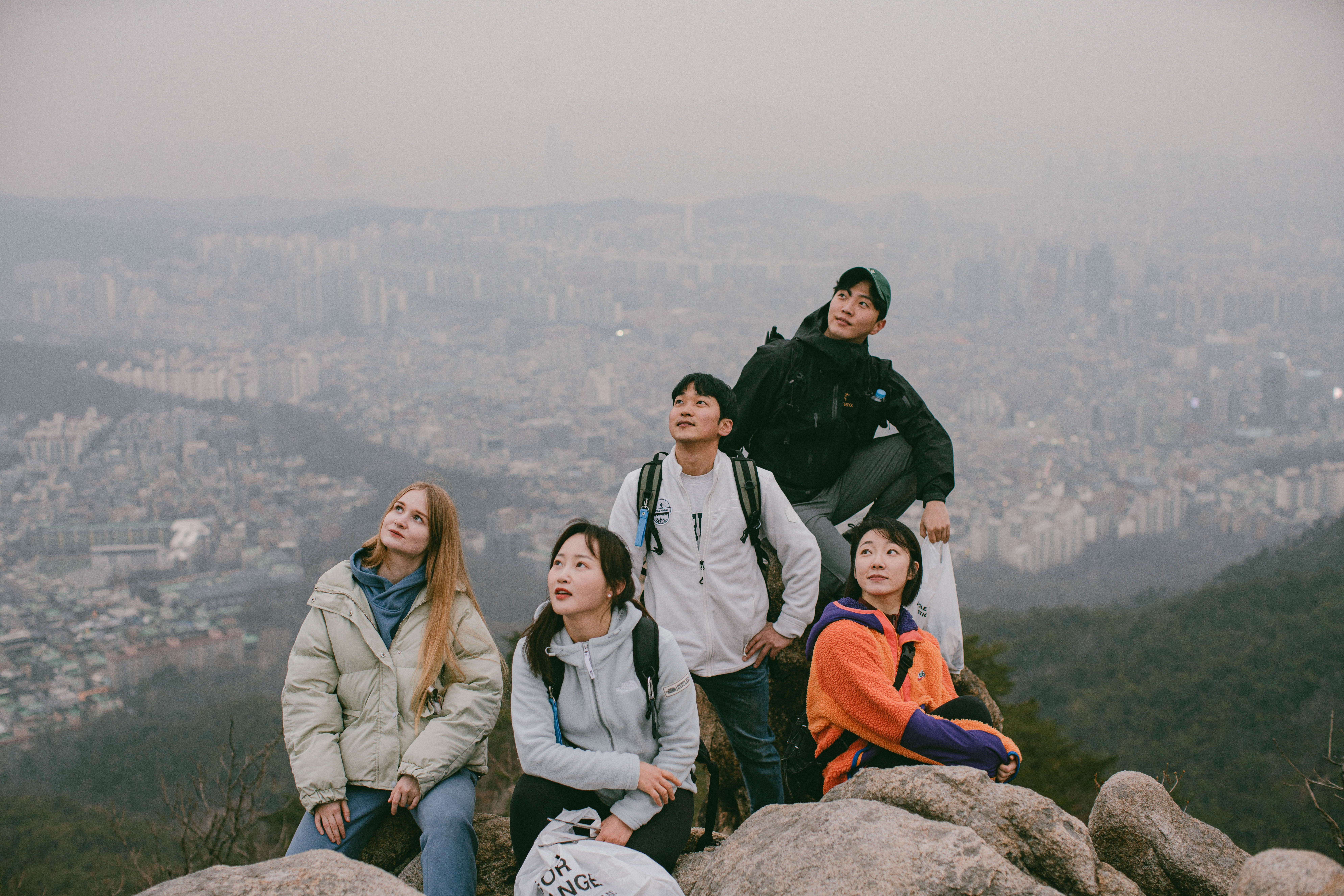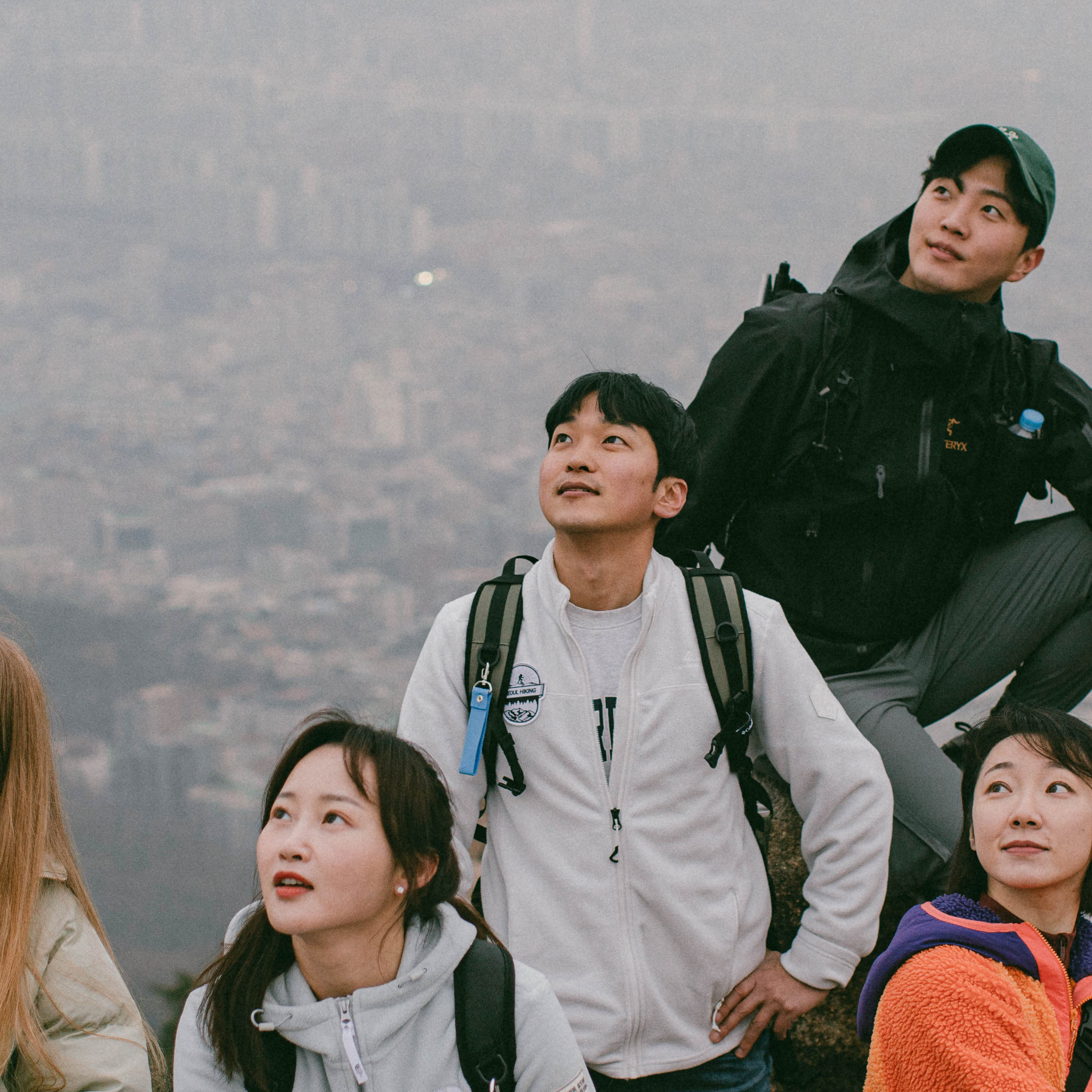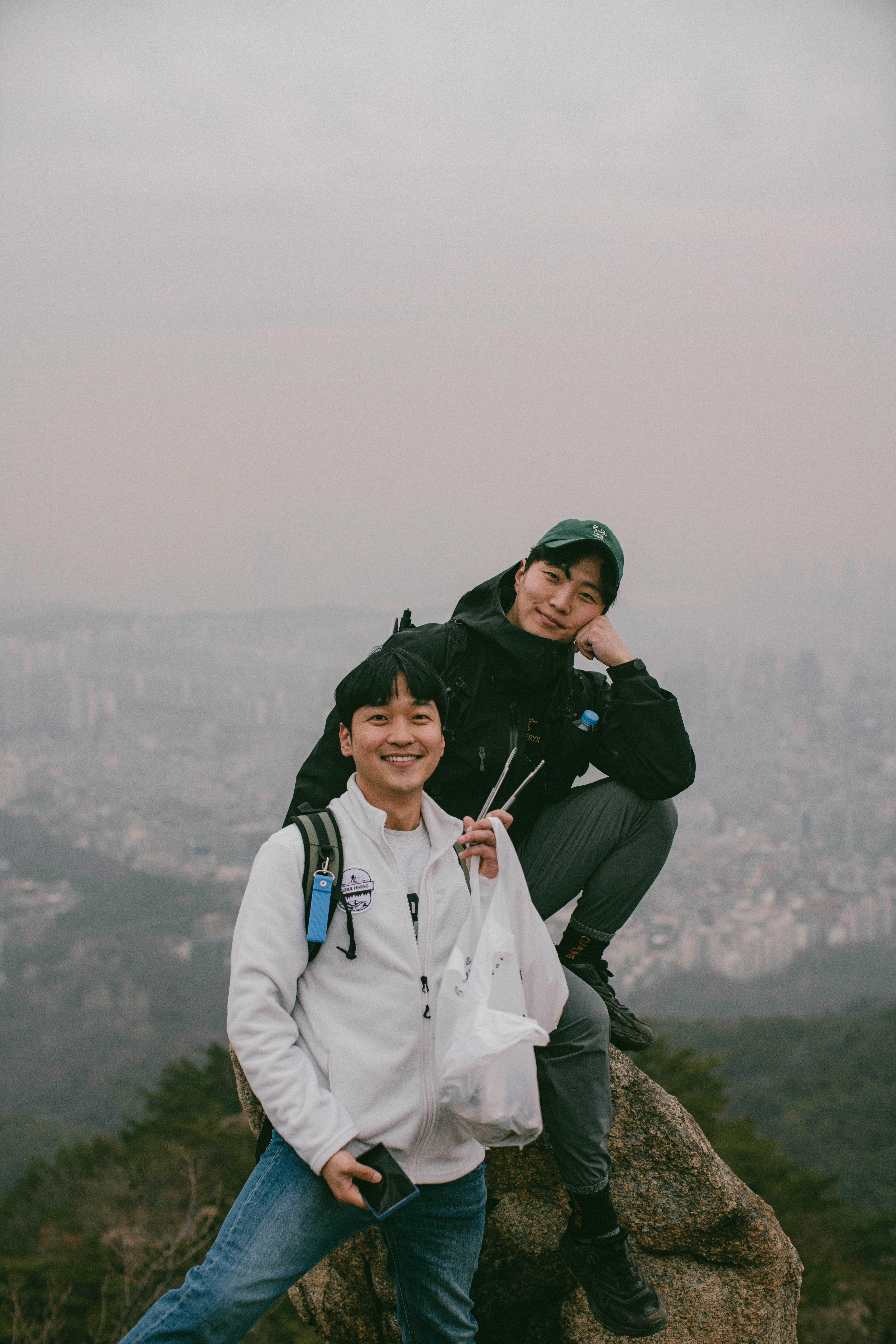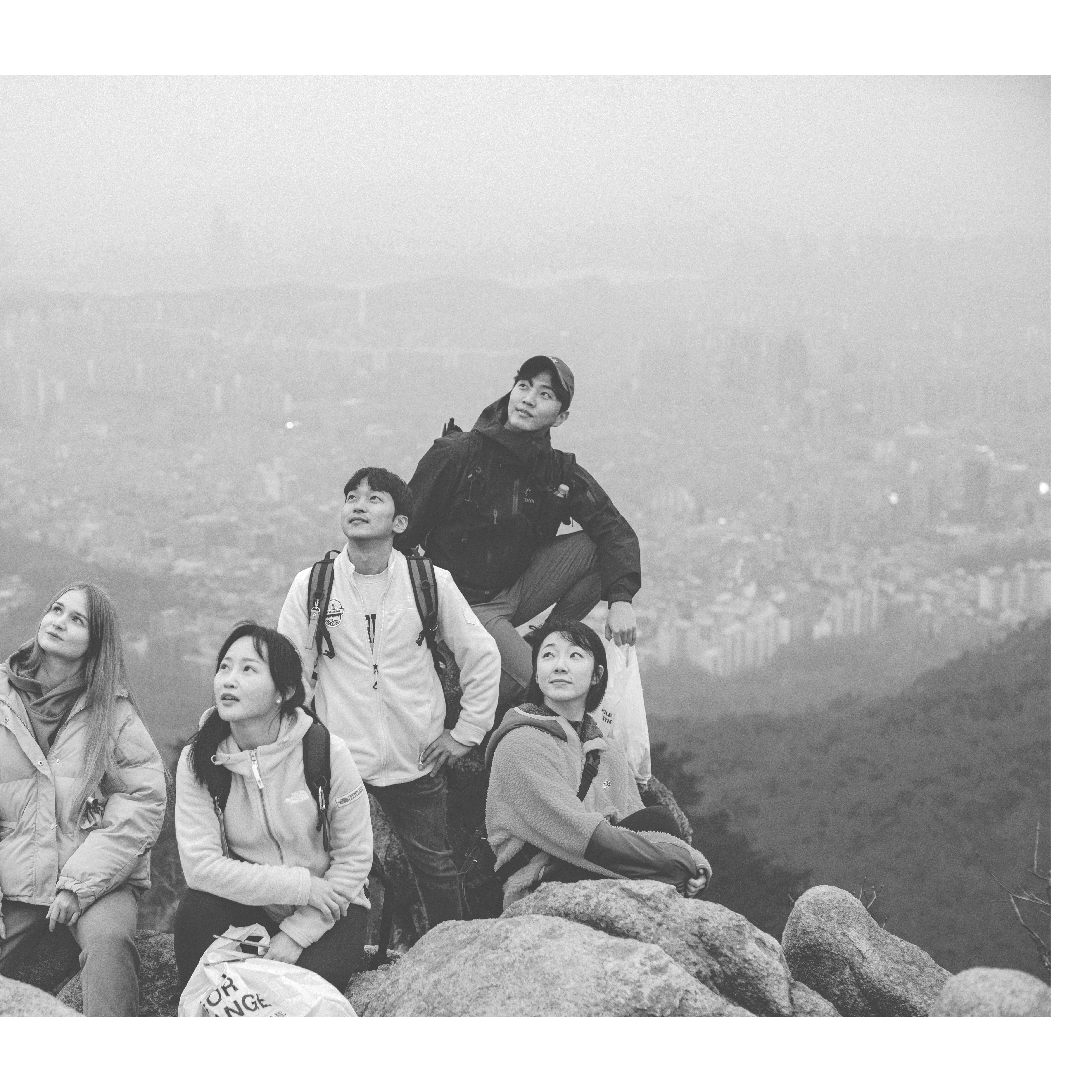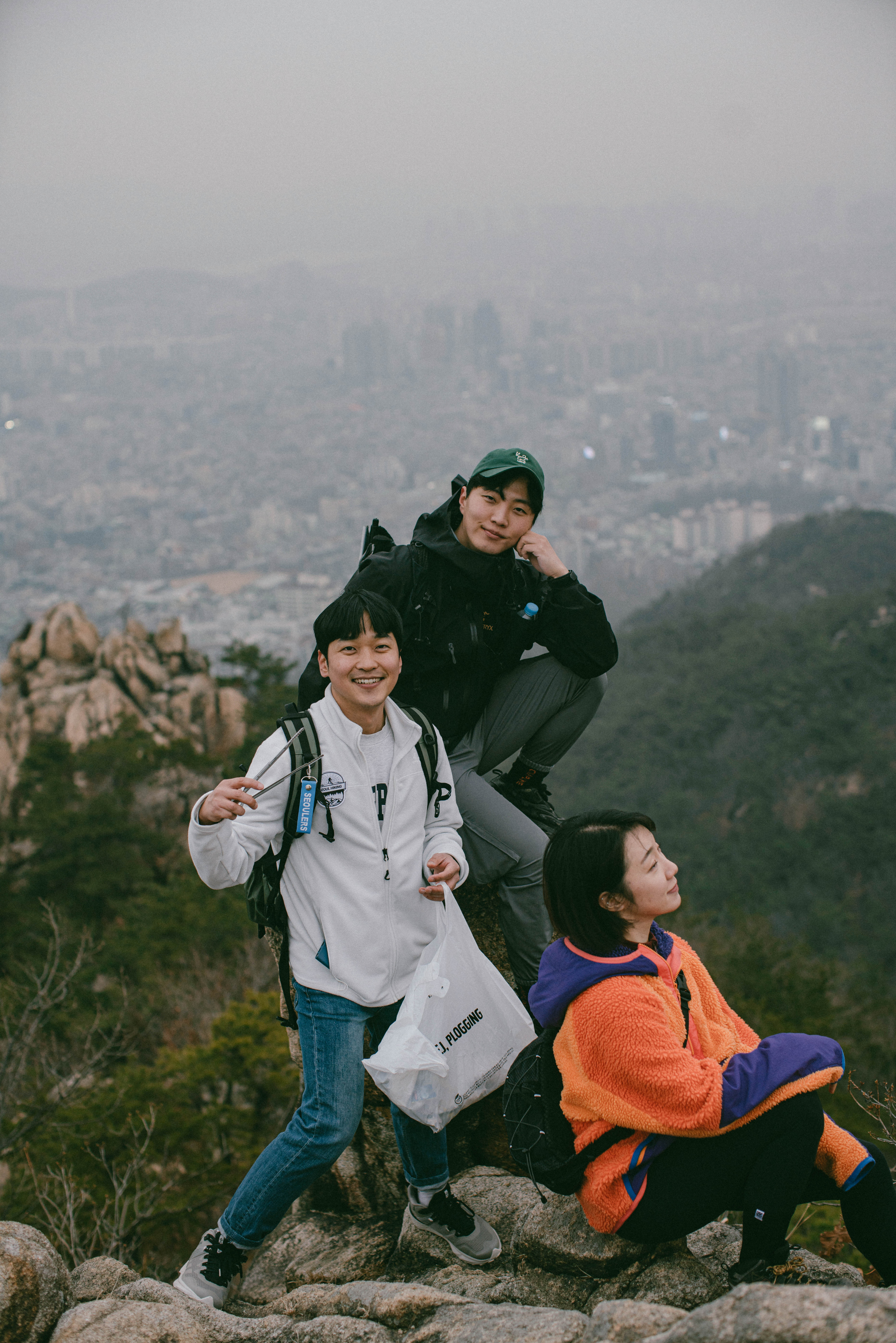 사실 서울러스와의 산행 중 대미를 장식한 국기봉 단체사진이다. 미세먼지로 인해 도시의 풍경이 제대로 담기지 않았지만, 산에서 찍는 '삼오필름'만의 단체 사진은 한명씩 등장시키며 단체컷 빌드업을 하는 재미가 있다.