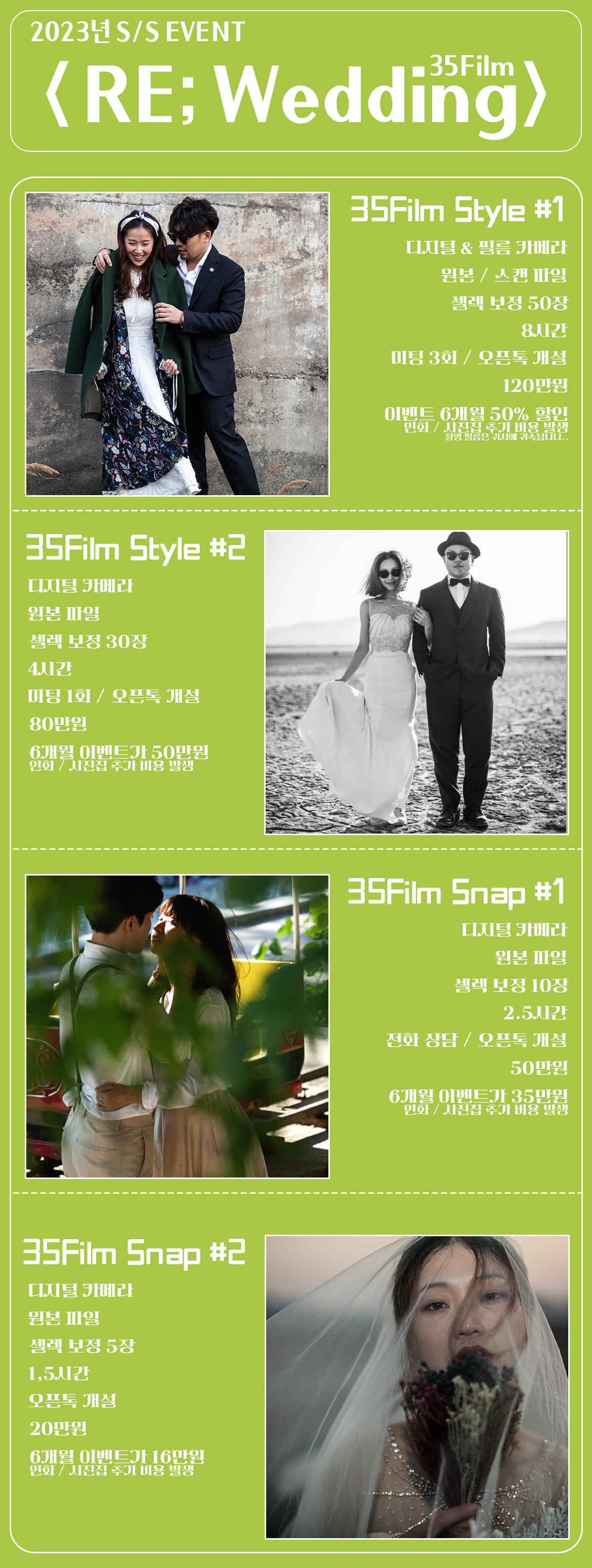 '삼오필름 스타일'은 결혼을 앞두신 부부나 특별한 사진을 가직하고 싶은 의뢰인들에게 추천합니다. 그리고 '삼오필름 스냅'은 간편하게 촬영하고 싶은 의뢰인들에게 추천을 합니다. 기본적으로 '삼오필름 시즌제'가 반영되는 촬영이면, 스튜디오에서 촬영하기 원하시는 분들의 촬영이 따로 있습니다.